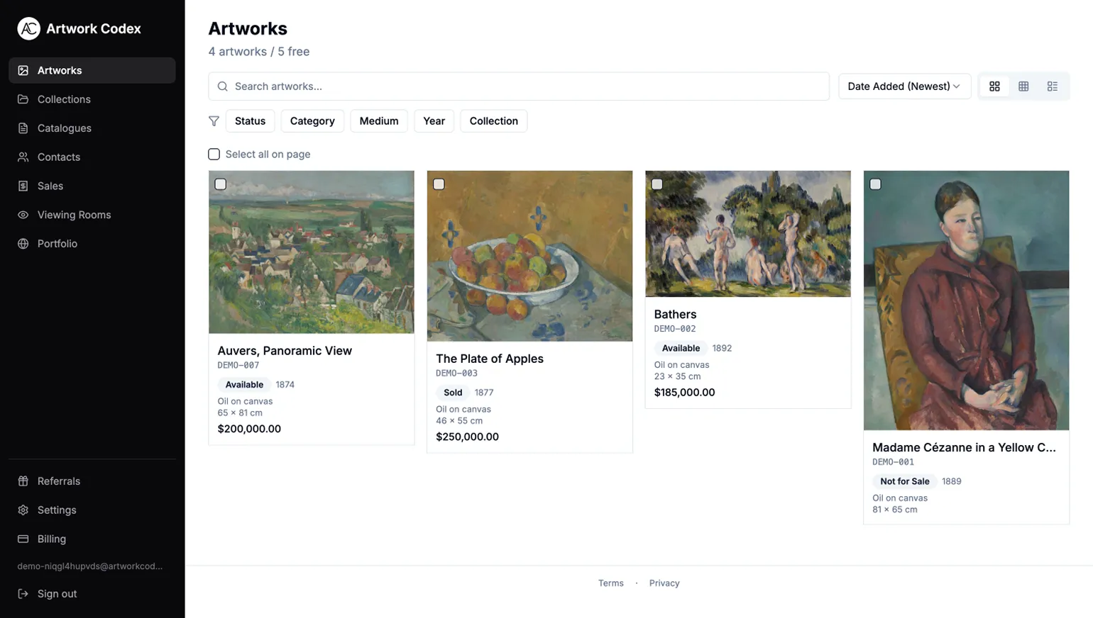 Catalog your artworks, organize collections, share viewing rooms, track sales, and build your public portfolio. All in one place.